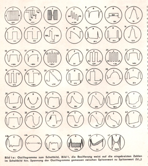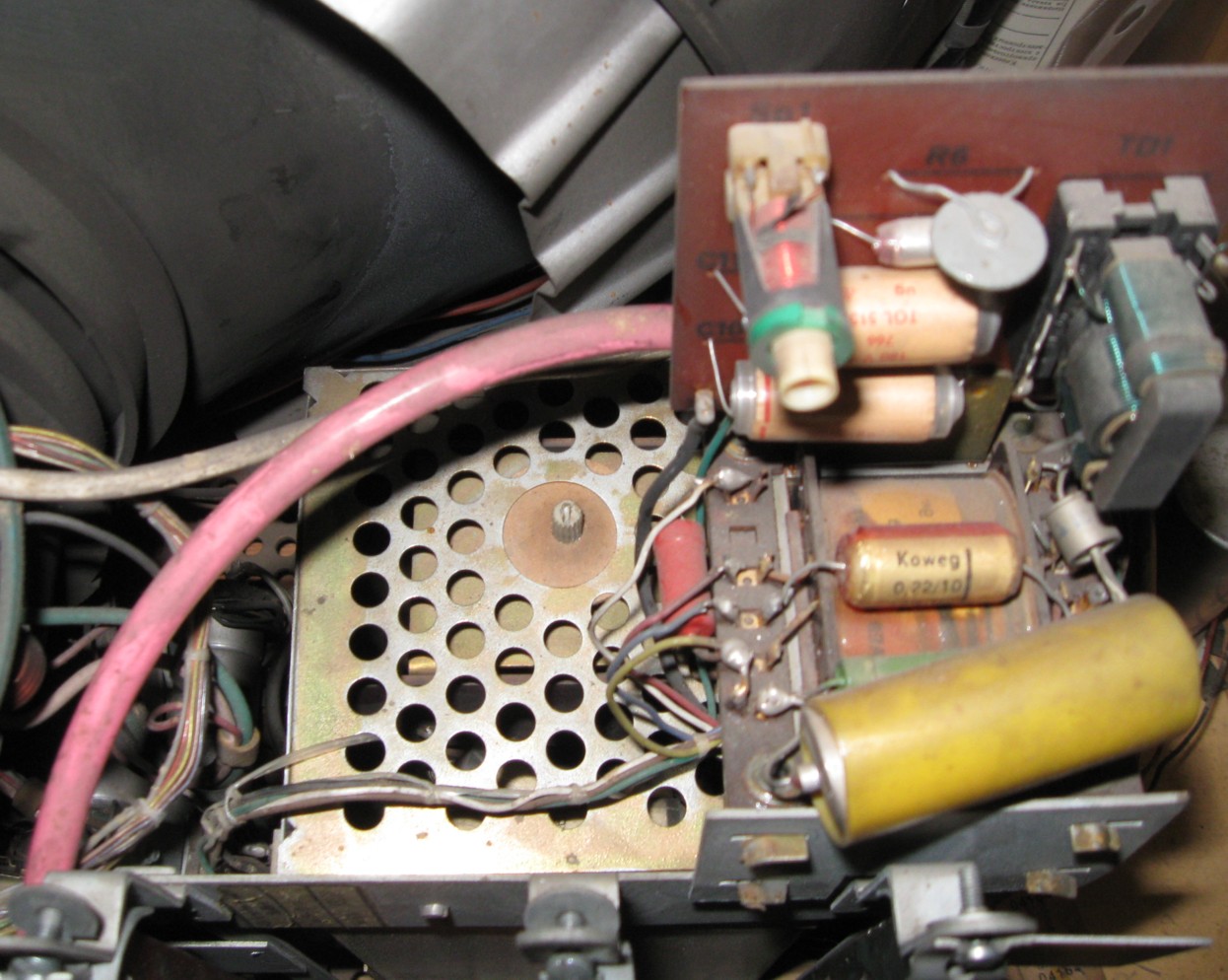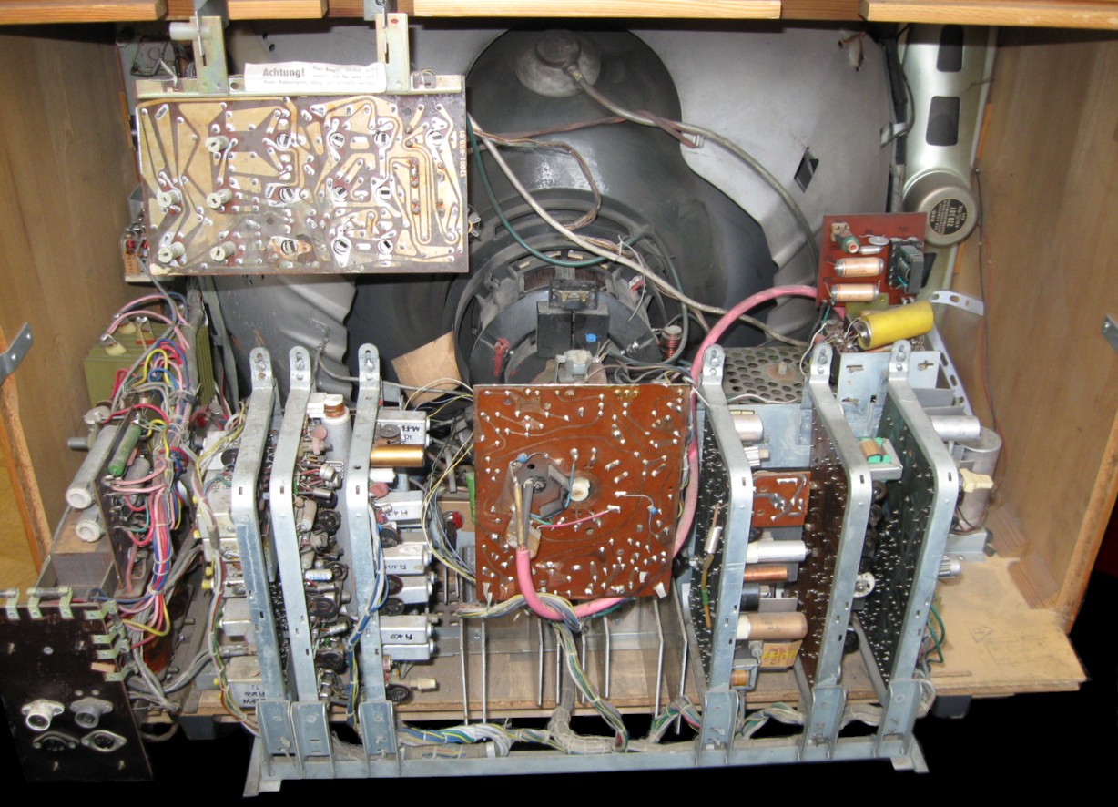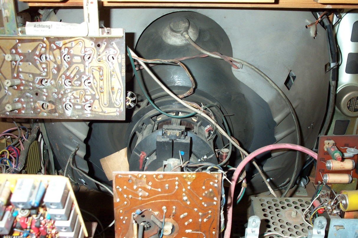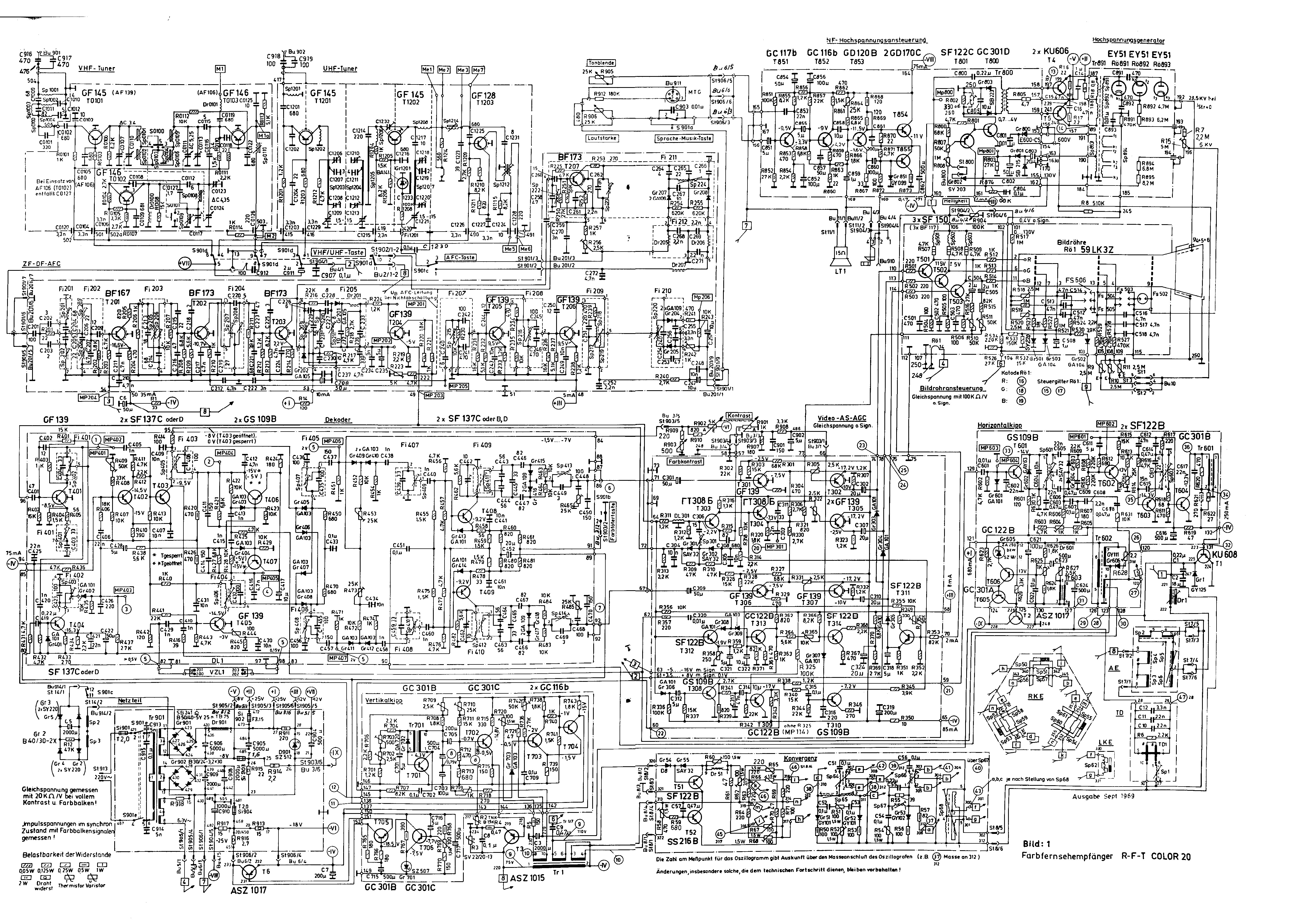 SchaltplanBanderole, Seiten, Daten, Oszillogramme, Schaltplan von 1969. Ausführliche Schaltungsbeschreibung ("R-F-T Autorenkolletiv: Farbfernsehen")Röhren59LK3Z oder A56-120X, in frühen Geräten: dreimal EY51. Warnung: Diese Webseite bietet Ihnen einen Einblick in das Innere des Gerätes. Beachten Sie bitte, dass die Entfernung von Rückwänden und Abdeckungen nur dem Fachmann vorbehalten ist. Das gilt besonders, wenn das Gerät eingesteckt ist, in Betrieb ist oder unter elektrischer Spannung steht. Verbrennungen oder gar tödliche Stromschläge können die Folge sein! Aber auch bei Netztrennung besteht die Gefahr, dass bei unsachgemäßer Vorgehensweise bösartige Stromschläge geschehen können. Insbesondere die Bildröhre und die mit ihr verbundenen Baugruppen können noch Stunden oder Tage nach der letzten Inbetriebnahme weit über 10.000 Volt Hochspannung führen. Der Autor lehnt jede Haftung für Verletzungen und Schäden, resultierend aus den hier gegebenen Informationen ab und weist ausdrücklich darauf hin, dass für den Unkundigen vor dem Öffnen von Geräten Fachleute wie Elektriker oder Elektrotechniker befragt werden müssen. Photos: © Eckhard Etzold, 2008.