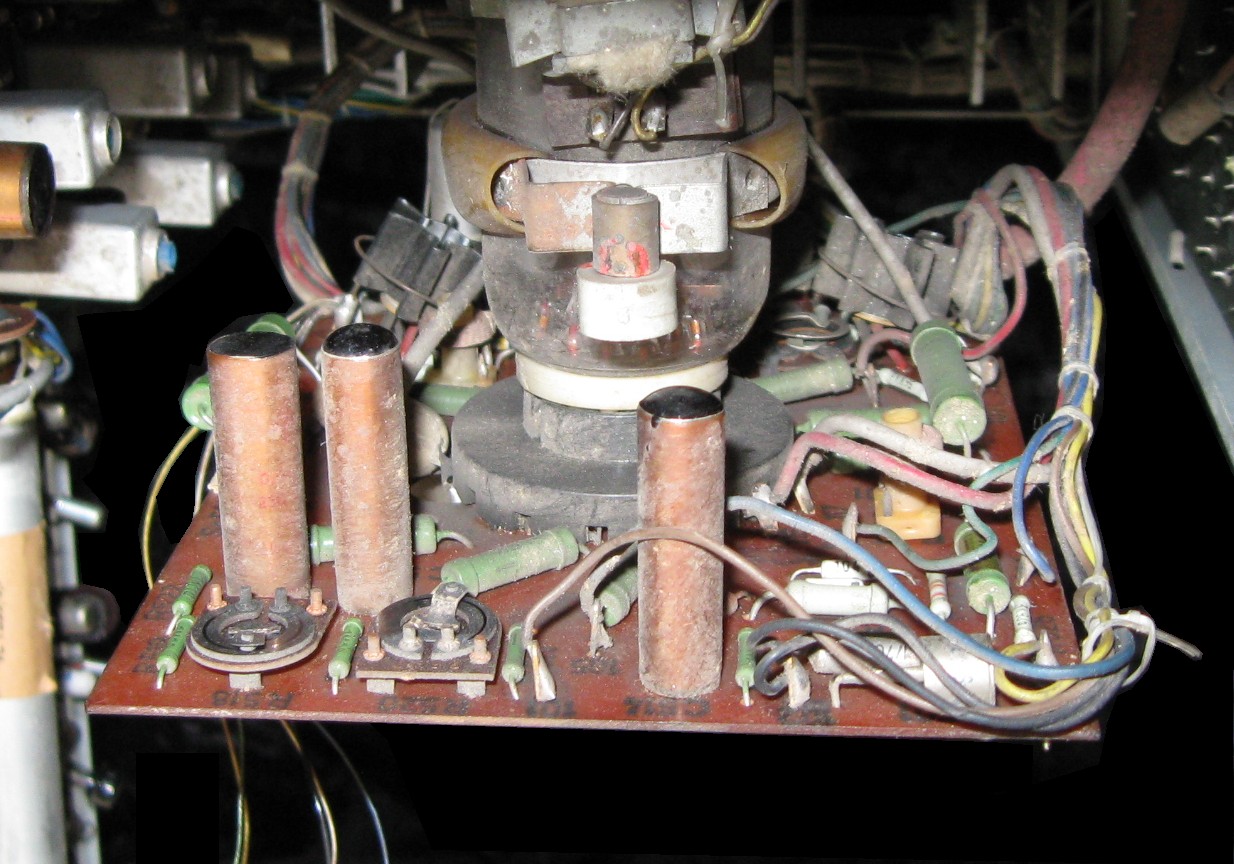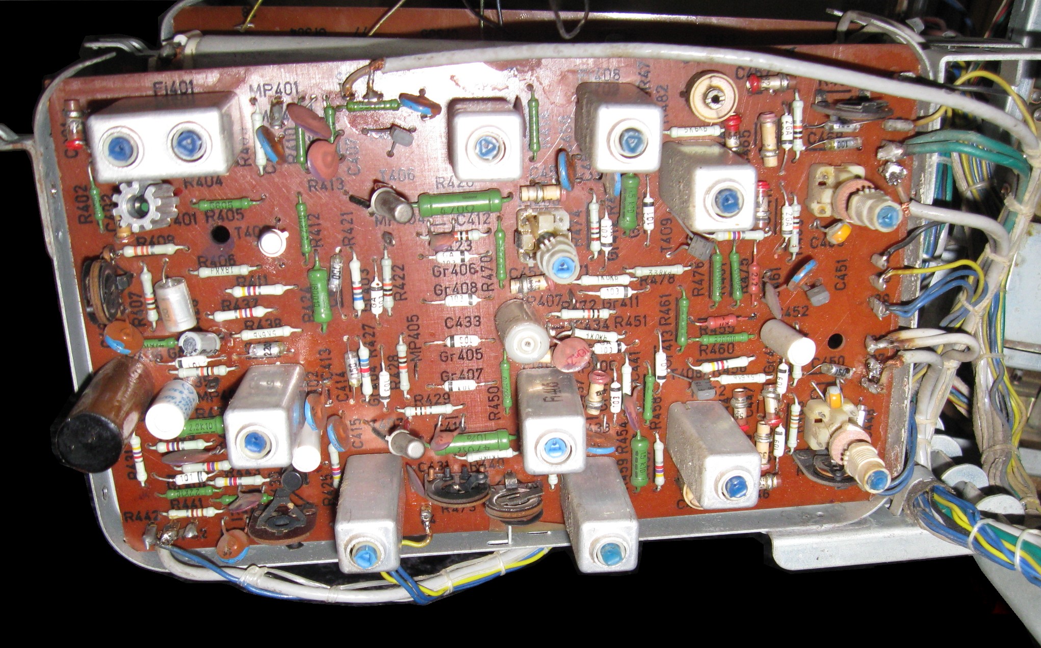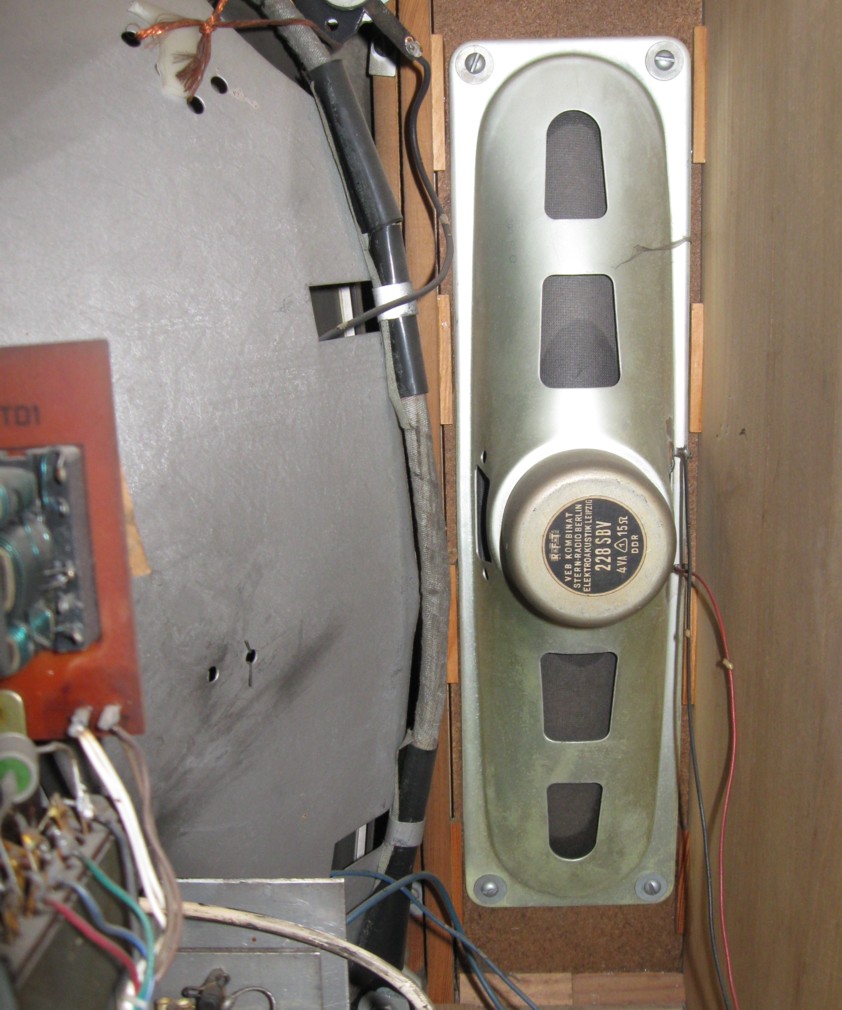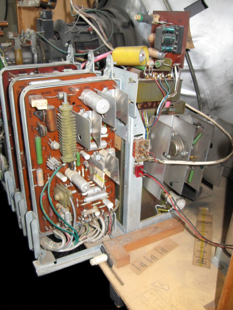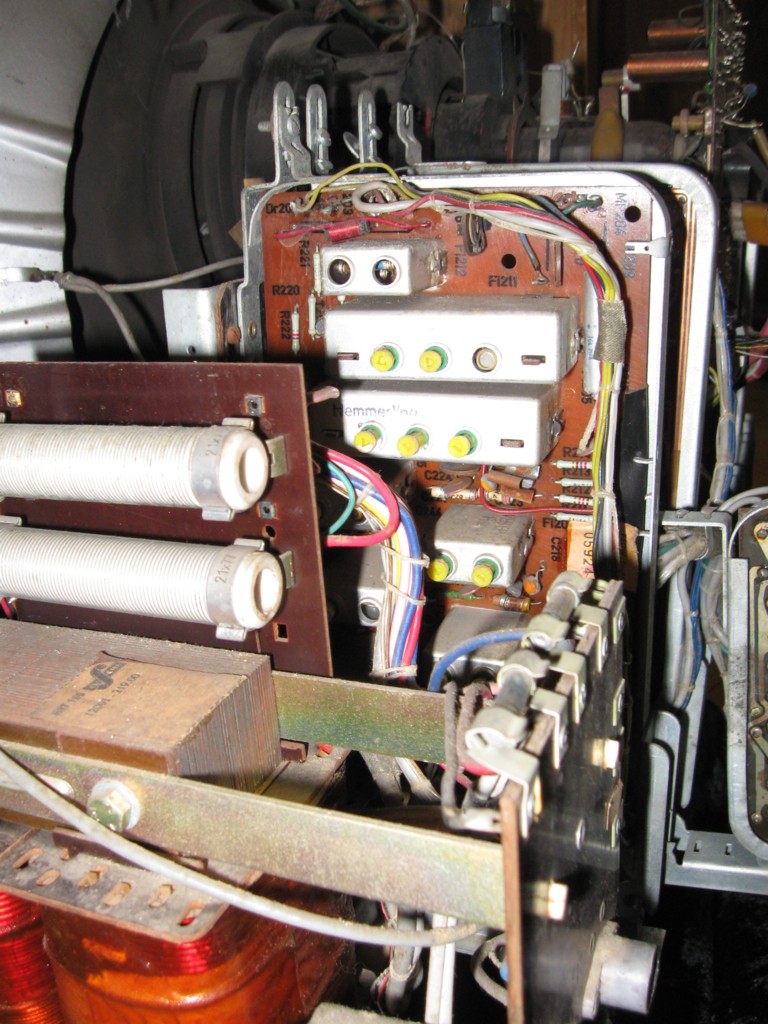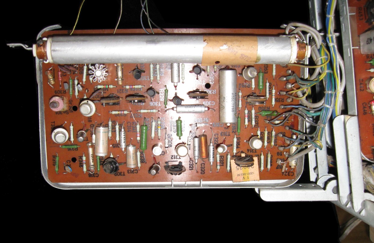SchaltplanBanderole, Seiten, Daten, Oszillogramme, Schaltplan von 1969. Ausführliche Schaltungsbeschreibung ("R-F-T Autorenkolletiv: Farbfernsehen")Röhren59LK3Z oder A56-120X, in frühen Geräten: dreimal EY51. Warnung: Diese Webseite bietet Ihnen einen Einblick in das Innere des Gerätes. Beachten Sie bitte, dass die Entfernung von Rückwänden und Abdeckungen nur dem Fachmann vorbehalten ist. Das gilt besonders, wenn das Gerät eingesteckt ist, in Betrieb ist oder unter elektrischer Spannung steht. Verbrennungen oder gar tödliche Stromschläge können die Folge sein! Aber auch bei Netztrennung besteht die Gefahr, dass bei unsachgemäßer Vorgehensweise bösartige Stromschläge geschehen können. Insbesondere die Bildröhre und die mit ihr verbundenen Baugruppen können noch Stunden oder Tage nach der letzten Inbetriebnahme weit über 10.000 Volt Hochspannung führen. Der Autor lehnt jede Haftung für Verletzungen und Schäden, resultierend aus den hier gegebenen Informationen ab und weist ausdrücklich darauf hin, dass für den Unkundigen vor dem Öffnen von Geräten Fachleute wie Elektriker oder Elektrotechniker befragt werden müssen. Photos: © Eckhard Etzold, 2008.