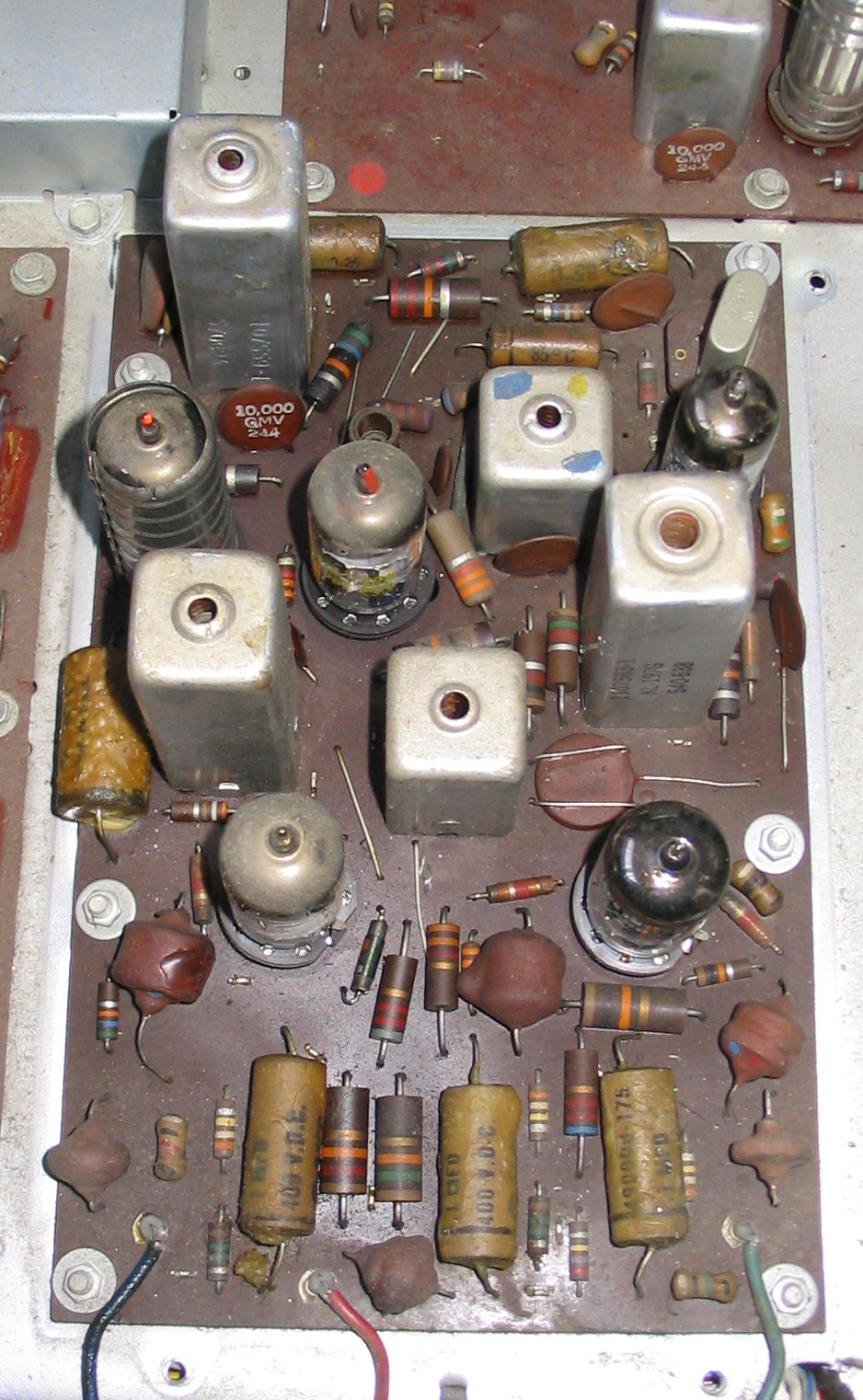 Hier ist das Blech entfernt. Deutlich sind noch die ursprünglichen Kondensatoren zu erkennen,