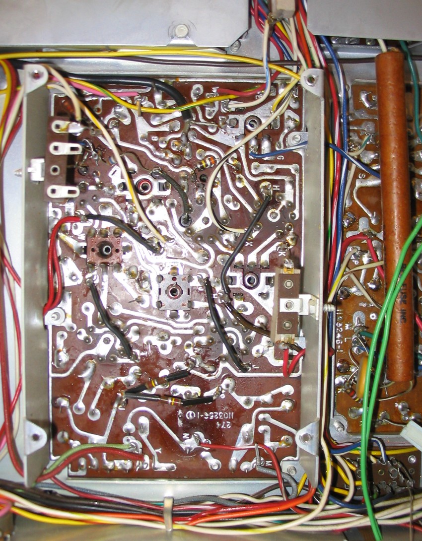 Im Vordergrund sieht man die Zuleitungen für die Farbbildröhre. In der linken Hälfte des Photos ist ein fehlerhafter