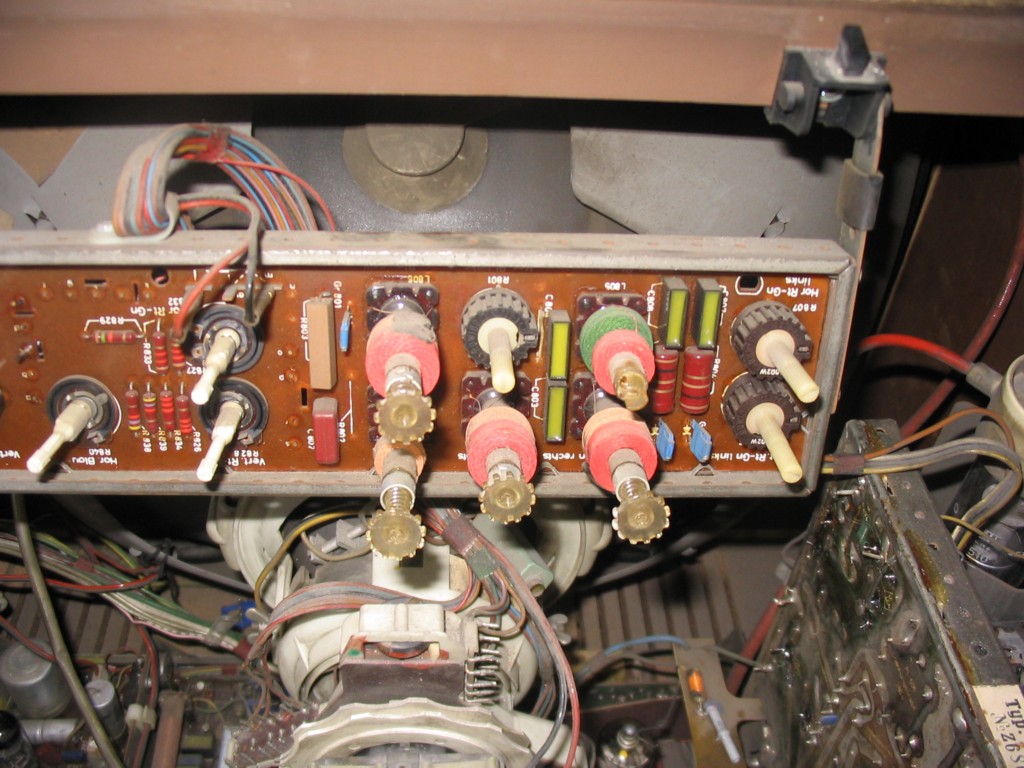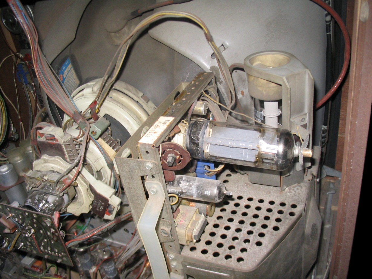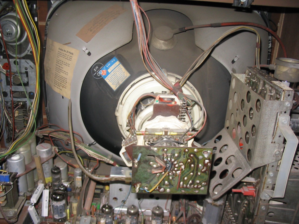 Der Apparat hatte 27 Jahre im Keller gestanden und war in dieser Zeit nicht benutzt worden. Die Bildröhre schien bei der Prüfung mit einem Bildröhrenprüfgerät ziemlich verbraucht zu sein: Rot 0,4 mA, Grü unter 0,1 mA, und Blau 0,1 mA. Grün und Blau waren praktisch nicht brauchbar, und Rot war nur mäßig.