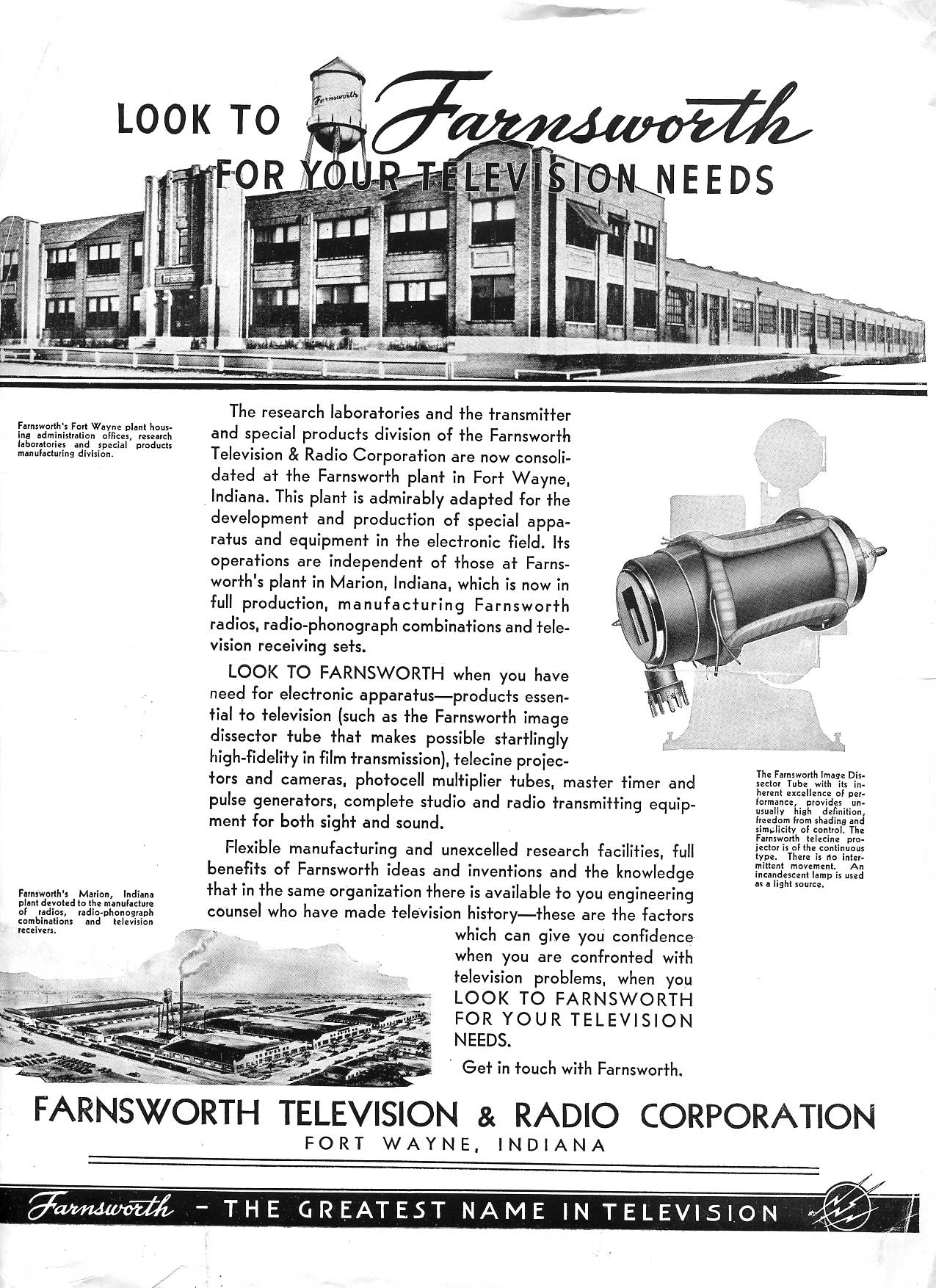 Early Electronic Television Farnsworth Image DissectorThis tube, made by Farnsworth in 1940, was designed for use in a film chain A shorter version for direct pickup use Courtesy of Art Bilski Farnsworth Laboratory about 1940 |