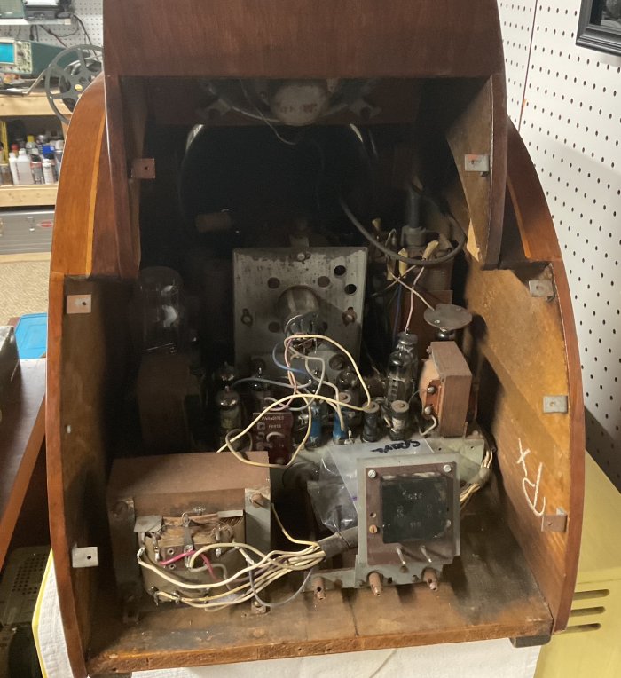 1949 Radiola RA-952, which uses is the same chassis as a Phillips TF–390X. was shipped from France years ago. The CRT is a MW22-14. This set is not equipped with a built in tuner. Donated to the museum by Al Hagovsky. Comments from Jermoe Halphen: Your Radiola RA-452 As you know, Radiola was the other name Philips used for its products. Often slightly different styling, but same electronics. The ETF photo mentions it's identical to the Philips TX-390 TV, we have it in our database, extensive documentation including a 42 page Theory of operation + schematics Careful !! Power supply is an auto-transformer, so a "hot" chassis. EHT is a flyback type. Here is the schematic. Here is a brief history of the Paris transmitter.