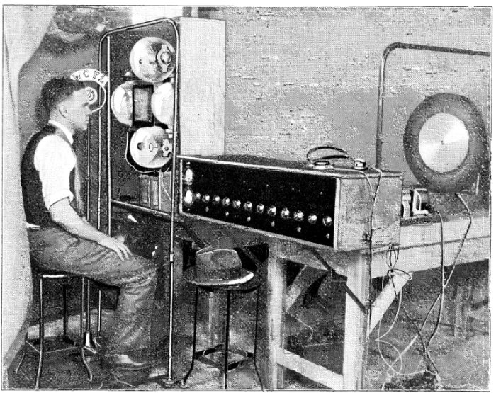Mechanical Television W9XAA, WCFL ChicagoThe first television station in Chicago was W9XAA, which went on the air in 1928. It was the television arm of what was then the Chicago Federation of Labor’s WCFL radio. On June 19th, 1928, the station broadcast the head and shoulders of E. N. Nichols, the secretary of the Chicago Federation of Labor. U. A. Sanabria headed the television broadcasts, which were from Navy Pier. The station was built by A. J. Carter. Sanabria later started W9XAO and Western Television, which probably made more mechanical television sets than any other company in the United States. WCFL's television equipment - June 12, 1928. M.L. Hayes at miccrophone; U.A. Sanabria and Virgil Schoenberg giving the demonstration.
