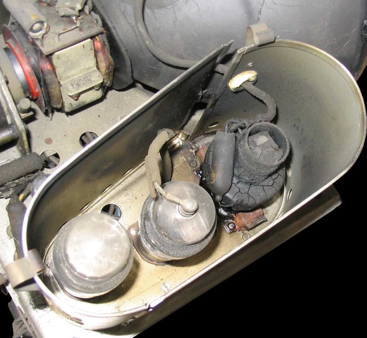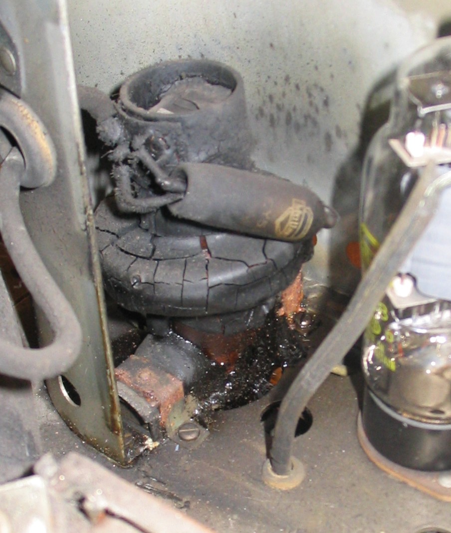 While testing the set, suddenly there was a failure. From one moment to another I got a very quiet line whistle, a short moment only a vertical line and then no high voltage, no picture. At first I thought the line output transformer was burned. Of course it looked very bad. It looks like some tar melted. For safety reasons I inserted a resistor between screen grid of the PL38 and booster voltage like Darius has recommended it.