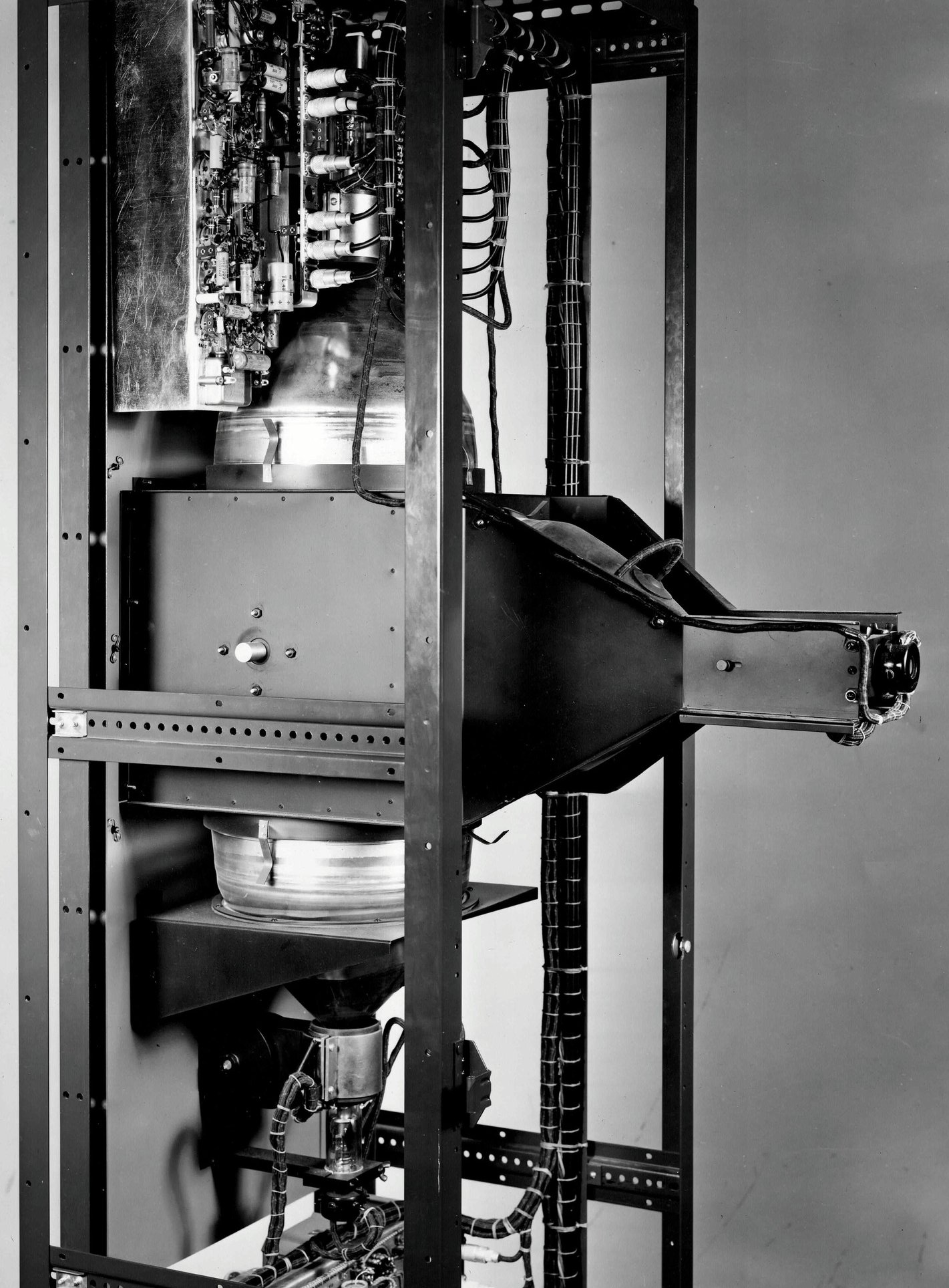 In March, 1950 RCA demonstrated its color sytem to the FCC. On the left is a set using a single gun color tube. In the center is a black and white set, and on the right is a set using a tricolor tube.